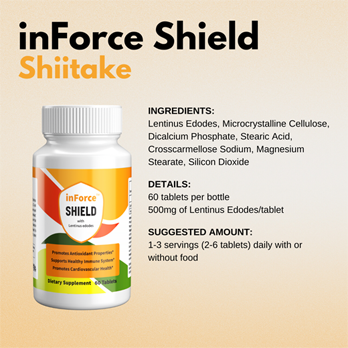 Our proprietary extraction process is designed to capture the essence of Shiitake, ensuring that every serving of inForce Shield delivers its full spectrum of beneficial properties. This powerful supplement is crafted to support your body's natural defenses, offering antioxidant benefits, and promoting cardiovascular well-being.